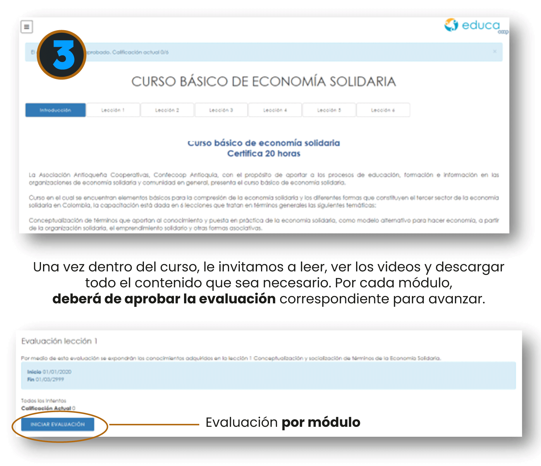 Una vez terminadas las 6 lecciones, usted podrá autogestionar su certificación en la misma web que es correspondiente a las 20 horas del ‘Curso Básico de Economía Solidaria’. Usted puede tener más información con su Asesor de Mercadeo Social, dando clic acá.
